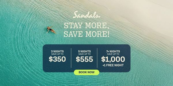 Sandals Stay More, Save More: book by April 20, 2026 for travel through Dec 25, 2027. Clients earn up to $1,000 instant credit based on length of stay, plus a free night on 7+ night bookings at select resorts.